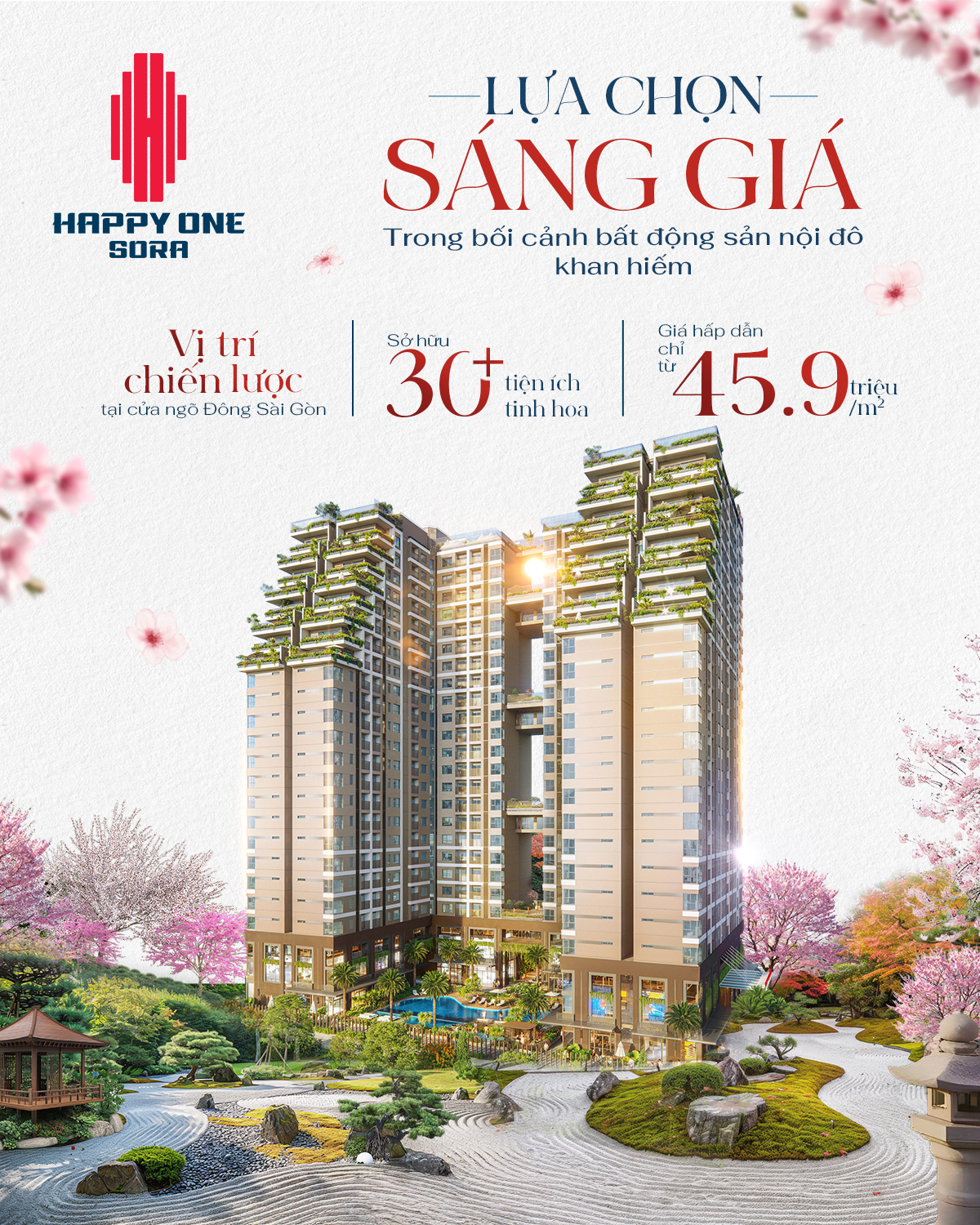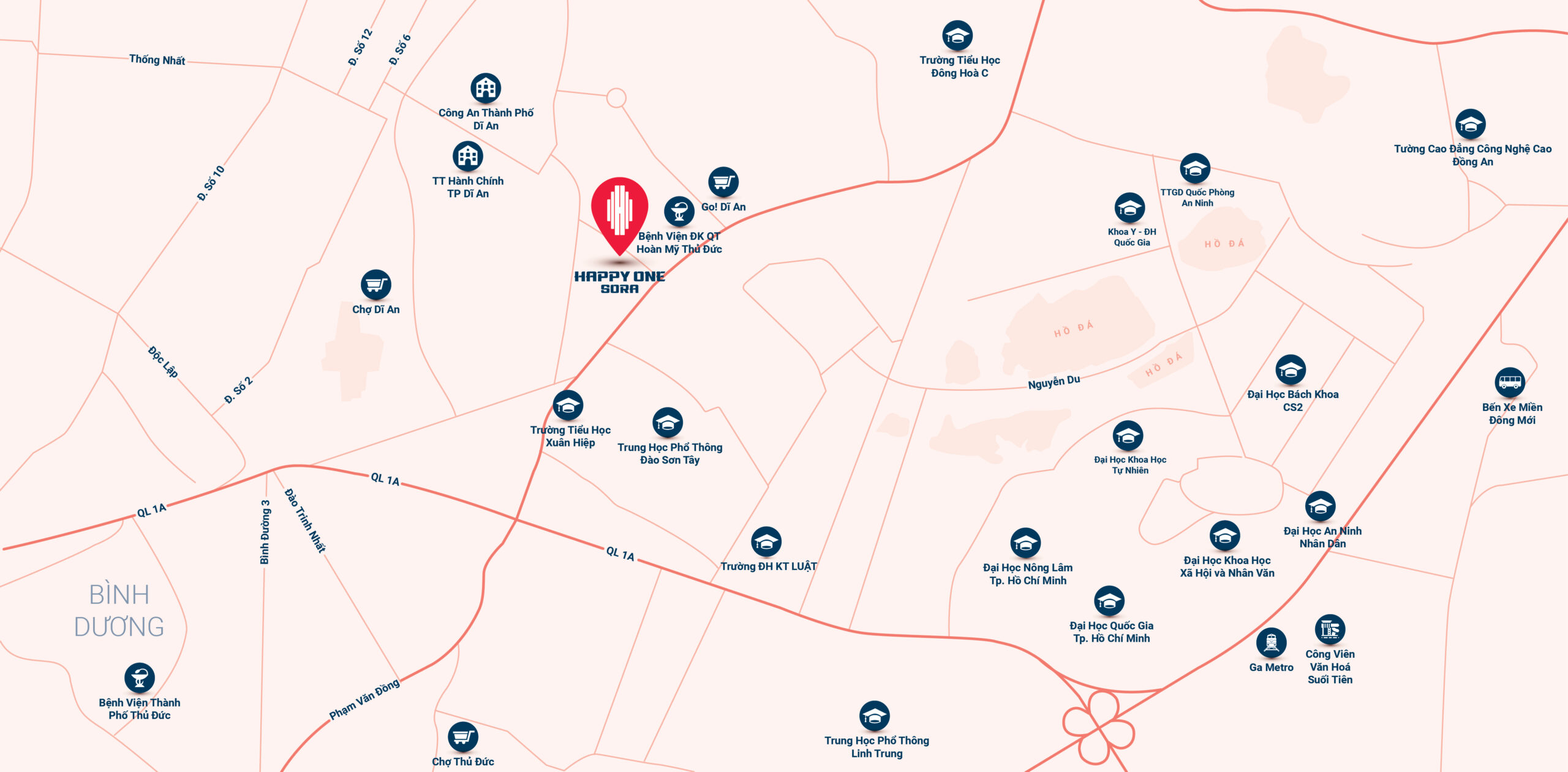 Tọa lạc tại quỹ đất hiếm của thành phố Thủ Đức – Happy One Sora là nơi an cư của hơn 1.200 cư dân văn minh trí thức cao với hơn 30 tiện ích đáp ứng nhu cầu sống tiện nghi, hiện đại.